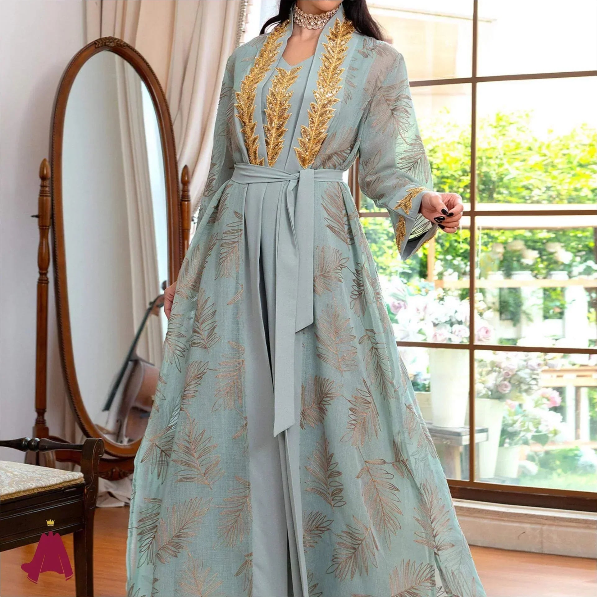 Vous rêvez d'une tenue qui vous fera briller comme le ciel étoilé? Notre Takchita Bleu Ciel est là pour faire de vous la star de la soirée sans détour! Laissez-vous envoûter par sa couleur éclatante qui fera tourner bien des têtes lors de vos événements spéciaux. Avec notre Takchita, soyez prête à montrer votre caractère unique sans effort!